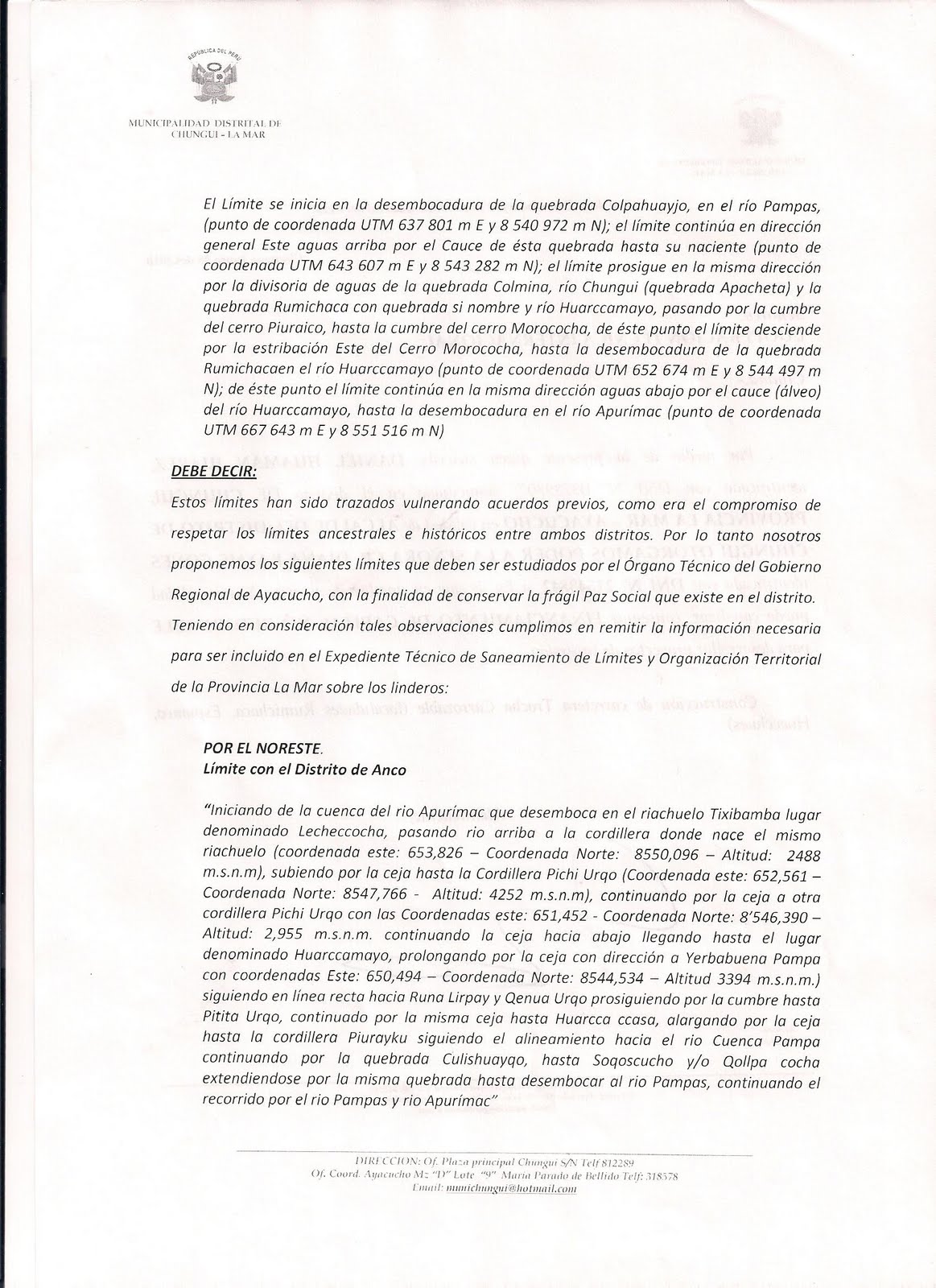 Gran sorpresa ha causado a la mayoría de los Chunguinos el avanzado estado del Proyecto de Ley de demarcación y organización territorial de la provincia de La Mar (Ayacucho), que incluye la creación del distrito de Samugari, con su capital Palmapampa, la modificación de los límites del distrito de Anco y el cercenamiento de un parte importante del distrito de Chungui.